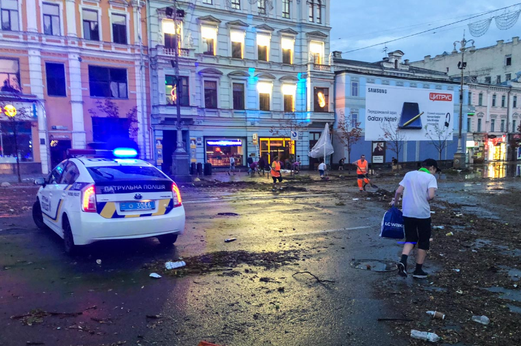 Оказались разбитыми рекламные щиты и вывески, были повалены деревья. Ночью вода затопила всю проезжую часть. Утром, после того, как потоки схлынули, оказалось, что Крещатик завален горой мусора и грязи. Сломанные ветки и мусор коммунальщики вручную достают из ливневок и устраняют последствия ночной грозы.