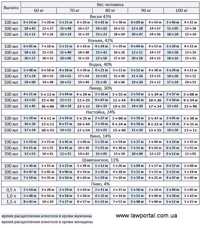 Таблиця виведення алкоголю