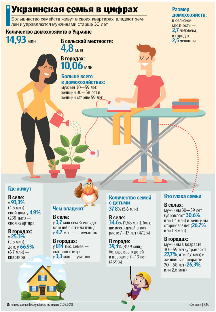 По данным официальной статистики, в Украине свыше 14,9 млн семей (см. инфографику). Их количество, по сравнению с прошлым годом, уменьшилось на 51 тысячу. Подавляющее большинство живет в городах: 39% — в крупных населенных пунктах (более 100 тысяч человек), 28% — в более мелких, а остальные — в селах. В Госстате отмечают, что для запада страны характерны более крупные семьи — здесь, в среднем, на одно домохозяйство приходится 3—3,5 человека. Самые маленькие семьи — в Кировоградской, Луганской, Черниговской и Донецкой областях.