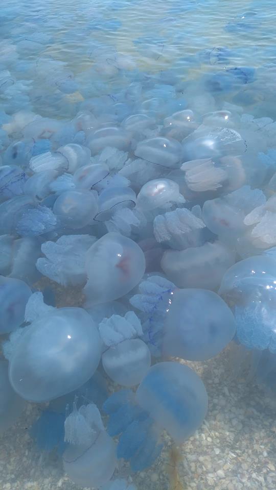 В Черном море сейчас буквально каша из медуз. У самой кромки воды еще как-то можно находиться, а вот отойдя от берега на несколько метров, попадаешь буквально в кисель из этих морских обитателей.