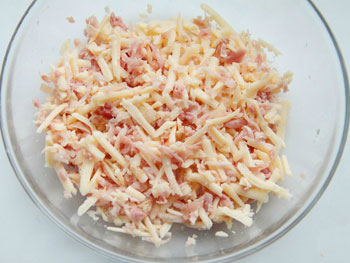 1. Ветчину и сыр трем на терке и соединяем. Начинка готова.