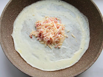 3. Выливаем половину яичной смеси на смазанную маслом сковороду. Огонь должен быть чуть меньше среднего. Как только масса схватится, кладем по центру начинку.