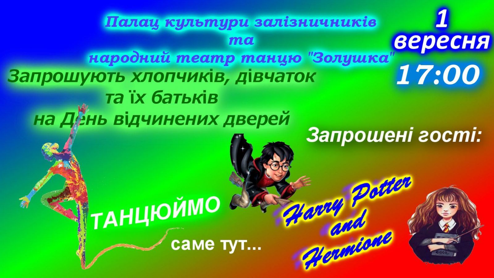 В субботу, 1 сентября, в 17.00 в ДК железнодорожников состоится День открытых дверей. Гостями праздника будут юные волшебники - Гарри Поттер и Гермиона. Хотя к волшебникам можно отнести и танцоров народного театра танца "Золушка", которые продемонстрируют чудеса хореографии. Приходите на праздник.