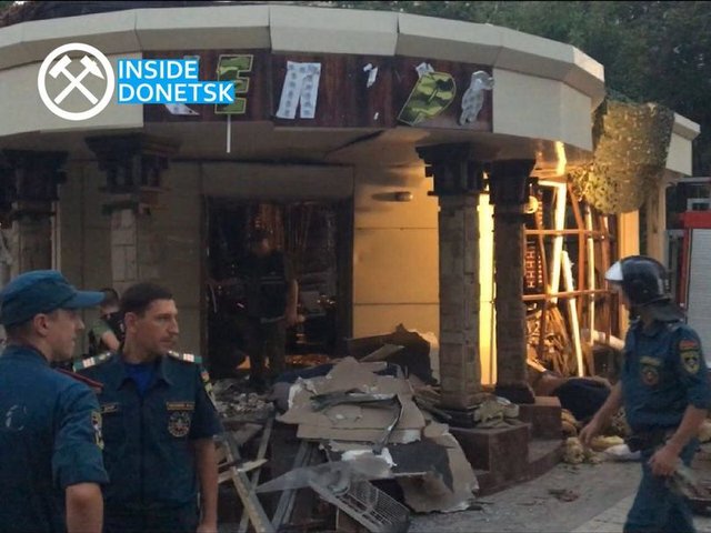 Сообщается, что от взрыва в кафе Сепар в центре оккупированного Донецка выбило все окна, стены здания обрушились.
