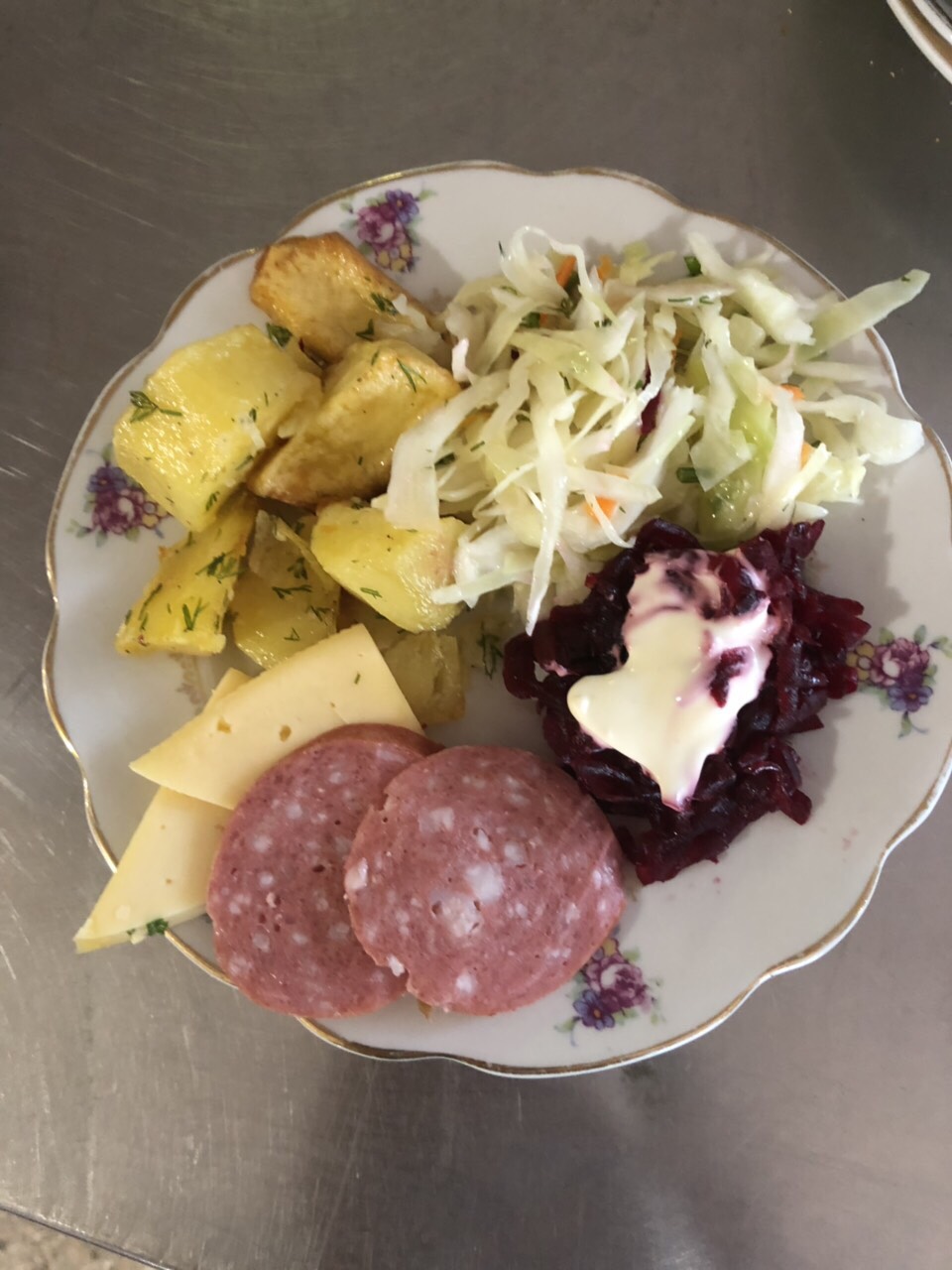 Что касается школы № 7, то сегодня ученикам предлагали свекольный салат и половинку яйца на 6,50 грн., картошку, салат и несколько кусочков колбасы с сыром за 12 грн. и пюре с капустным салатом и отбивной за 20 грн.