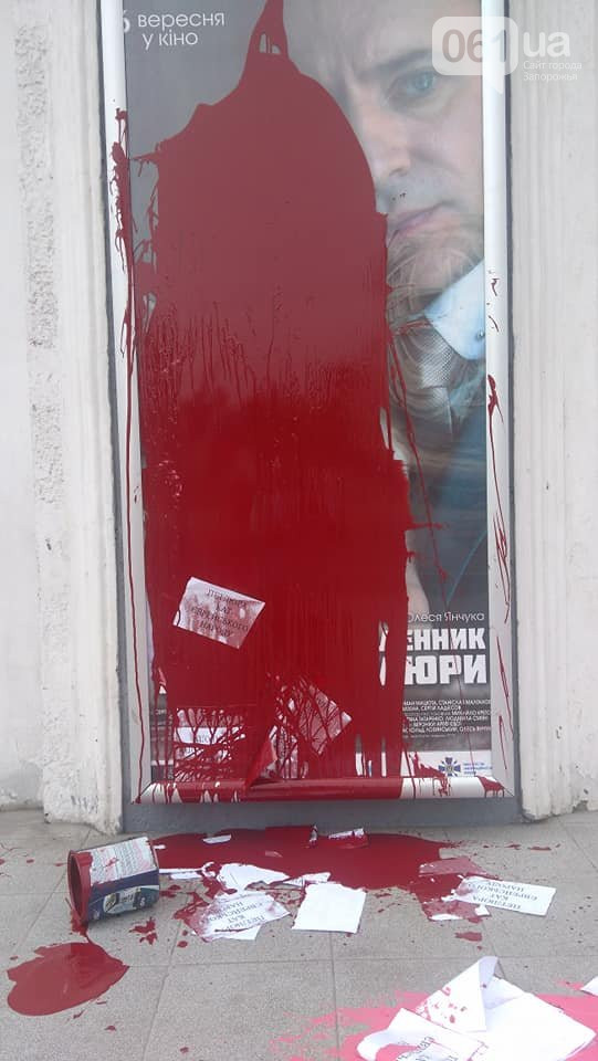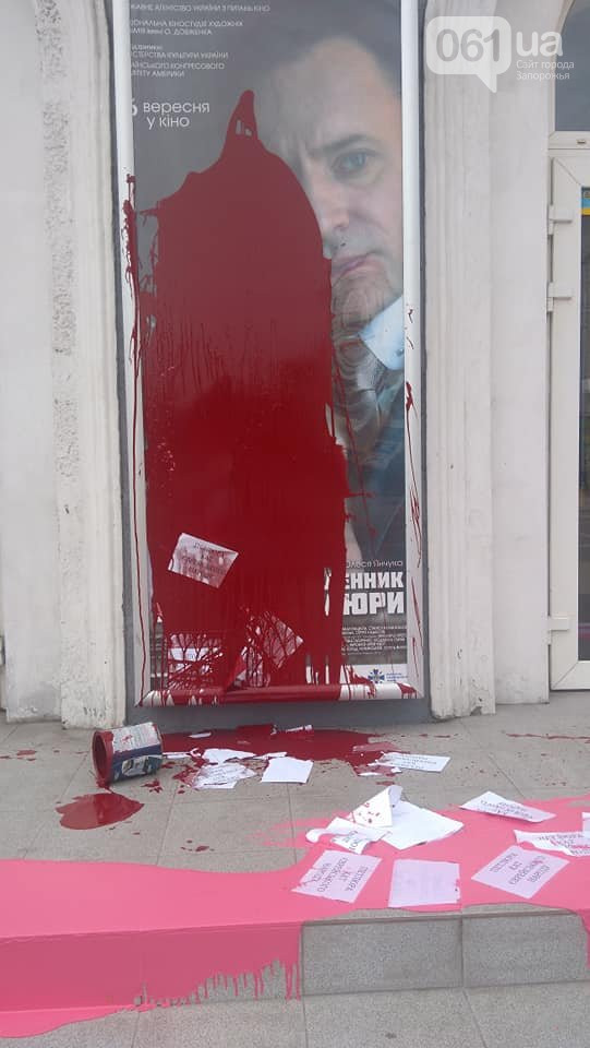 Сегодня, 6 сентября, в Запорожье двое неизвестных облили красной краской афишу фильма "Дневники Симона Петлюры" возле кинотеатра имени Маяковского.
