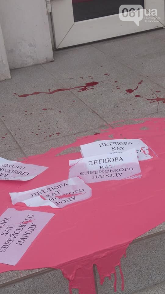 Также облившие бросили в краску листовки с надписью "Петлюра кат єврейського народу".