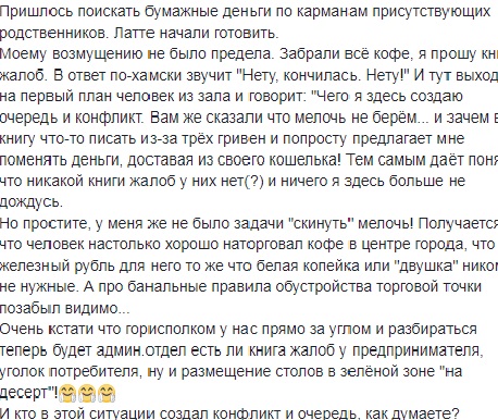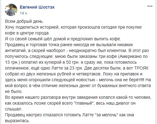 “В этот раз получилось следующее: мною были заказаны три кофе (Американо по 13 грн.) оплатил их купюрой в 50 грн. и сразу же, пока готовилось оплаченное, ещё одно Латте за 23 грн. Две десятки были, а вот ТРОЯК собрал из двух железных рублей и четвертаков. Ложу на прилавок и здесь меня огорошили следующей новостью – мелочь она не берёт!!! На мой вопрос в чём отличие железных денег от бумажных внятного ответа не было” – пишет автор поста.