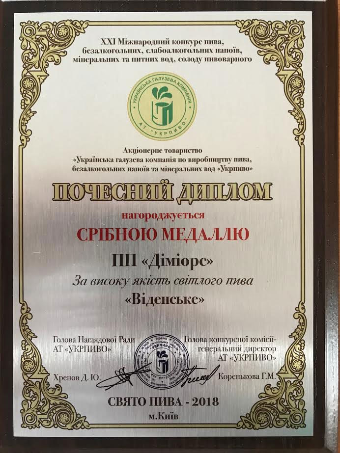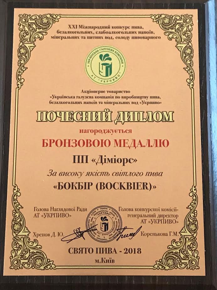 За высокое качество уже полюбившегося всеми светлого пива «Венское» предприятие было награждено серебряной медалью, а за новый сорт крепкого светлого пива «Бокбир» - бронзовой медалью.