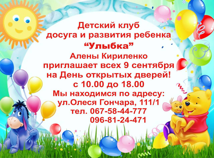 В воскресенье, 9 сентября, состоится открытие детского клуба досуга и развития ребенка "Улыбка".