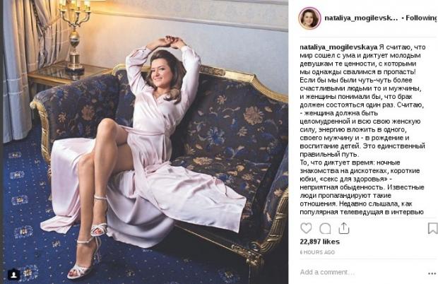 Наталья Могилевская добавила, что, по ее мнению, женщине нужно быть целомудренной. И что посвятить себя единственному мужчине, а также воспитывать детей — единственно правильный путь.