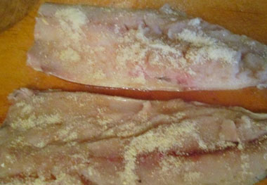 3. Посолите и поперчите филе, посыпьте желатином. Любителям более острой и пряной рыбы советуем добавить на этом этапе измельченный лавровый лист и нарезанный пластинами чеснок.