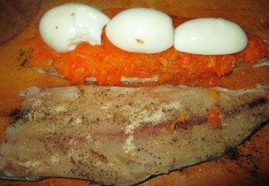 4. Выложите морковь на филе, сверху разложите половинки яиц.