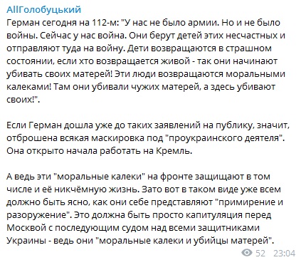 На такую речь экс-нардепа отреагировал блогер и политтехнолог Голобуцкий в своем Telegram-канале. Он напомнил ей, что именно эти «моральные калеки» защищают ее никчемную жизнь. Кроме того, эксперт отметил, что Герман ясно дала понять, как в Москве видят «примирение и разоружение»: капитуляция перед Кремлем с судом над воинами украинской армии, которые являются «моральными калеками и убийцами матерей».