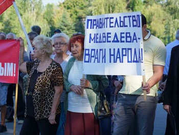 Как сообщается, участники митинга единогласно проголосовали за резолюцию с требованием отставки российского правительства Дмитрия Медведева и формирования "левоцентристского правительства народного доверия, способного вывести страну из кризиса".