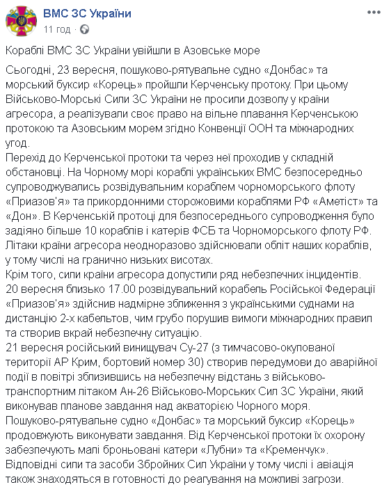 Так, 23 сентября Керченский пролив прошли поисково-спасательное судно «Донбасс» и морской буксир «Корец». Но этот переход украинским судам пришлось осуществить в чрезвычайно сложной обстановке.