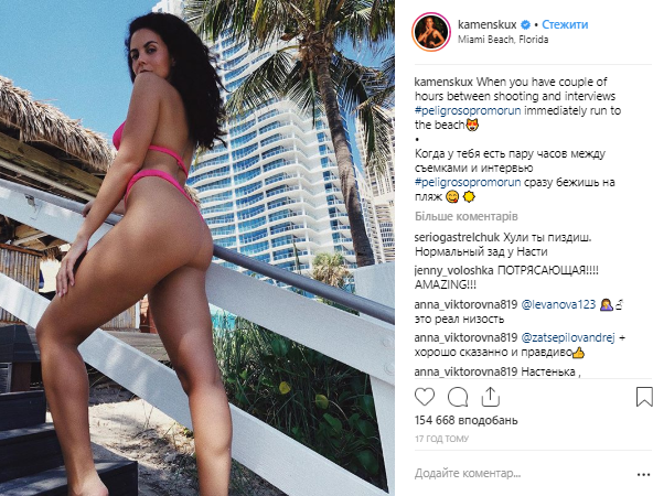 "Когда у тебя есть несколько часов между съемками и интервью, сразу бежишь на пляж", - прокомментировала Каменских свое пикантное фото.