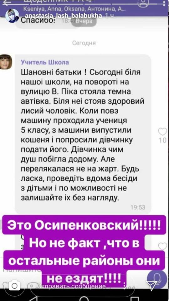 Так, вчера в соцсетях встревоженные мамы рассказали о том, что в Осипенковском районе маньяк на автомобиле заманивает к себе девочек.