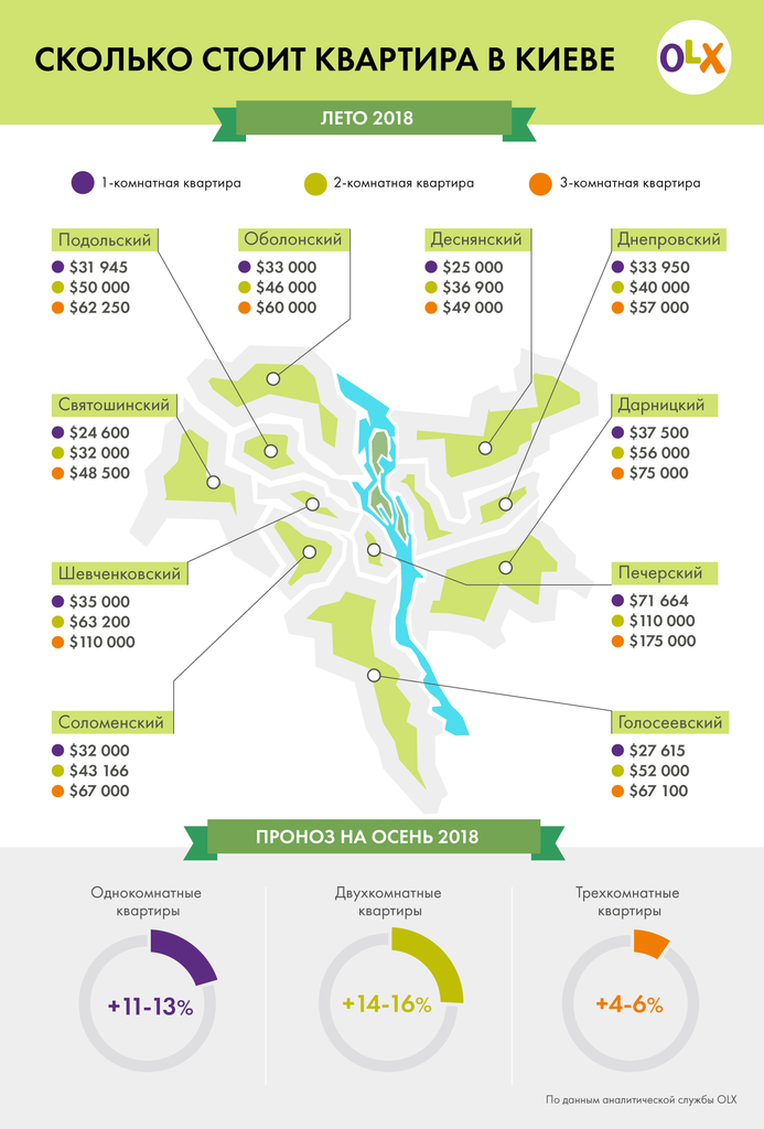 Стоимость двухкомнатных квартир составила до $37 тыс. в Деснянском и Святошинском районах, а за $40 - $56 тыс. можно было присмотреть варианты на левом берегу в Днепровском и Дарницком районах, а также на правом в Подольском, Голосеевском, Оболонском и Соломенском.