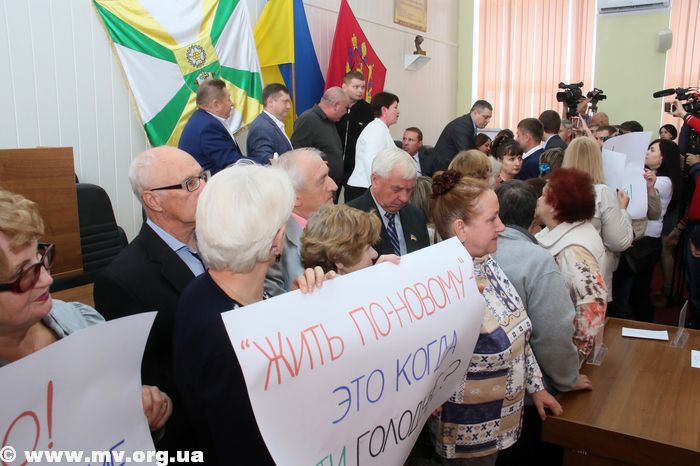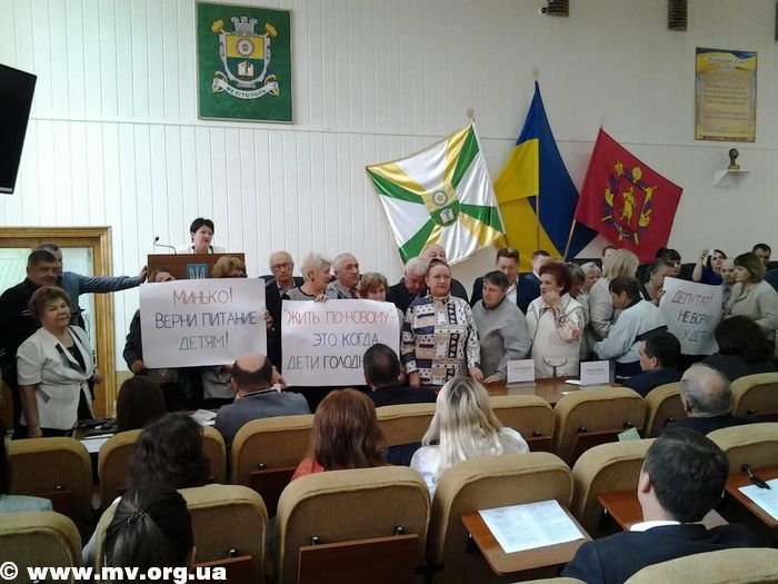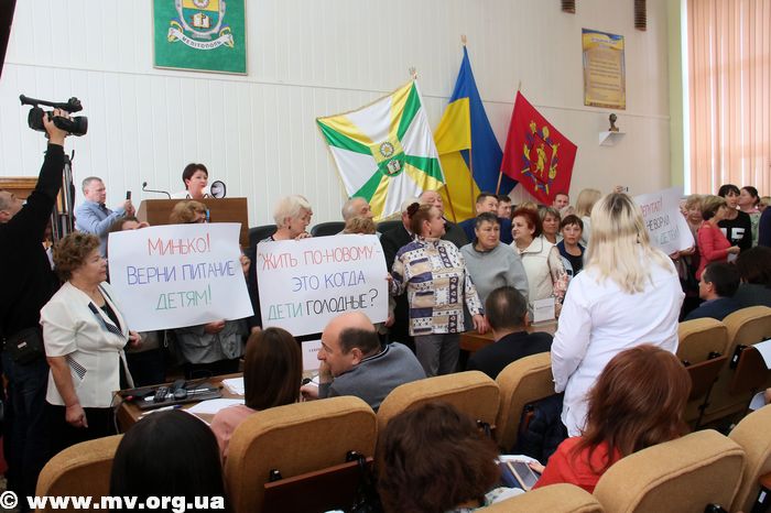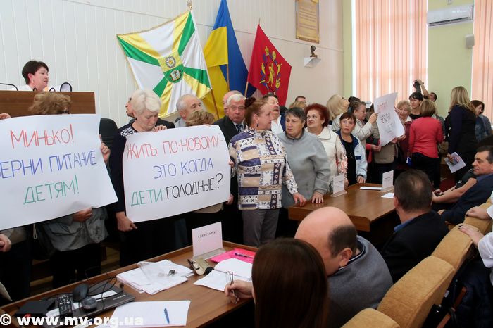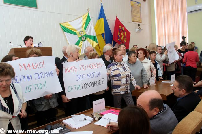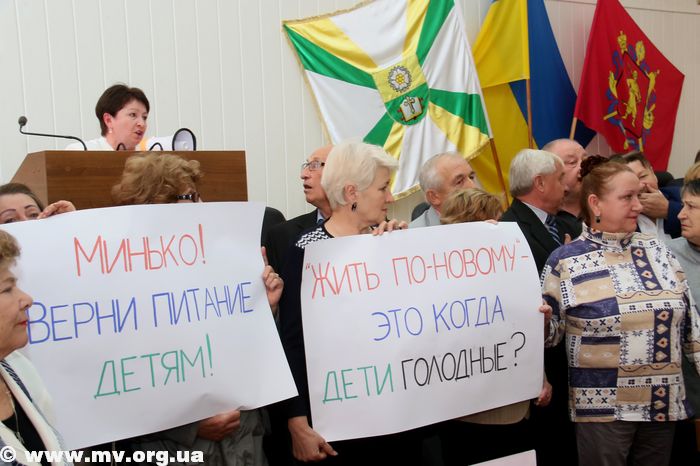 Однако к трибуне она вышла не сама. Вместе с ней еще три десятка горожан с плакатами "Минько, верни питание детям", "По-новому - это когда дети голодные" и другими.