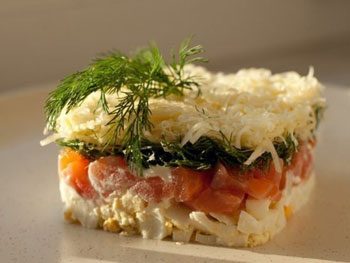 Семга в данном салате выступает главным компонентом и по цвету, и по вкусу, потому его лучше оформить слоями, выделив акцент.