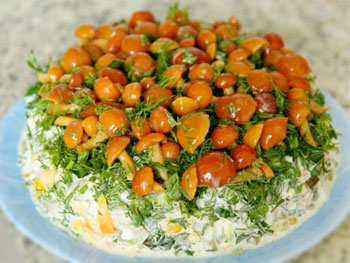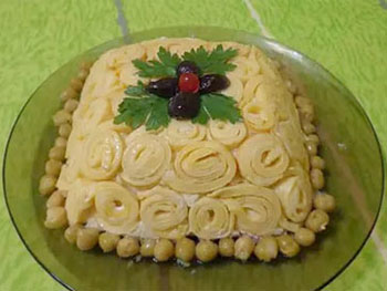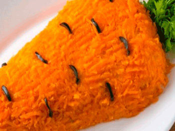 5. Сверху салат украсить тертой морковкой, дополнить маслинами, из петрушки сделать хвост.