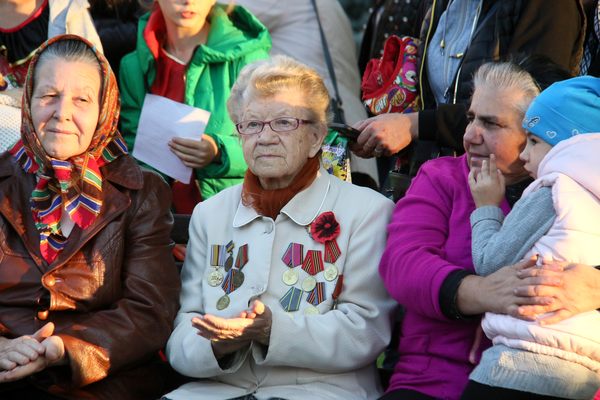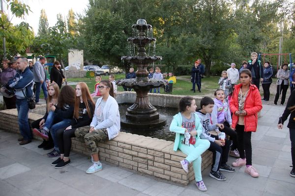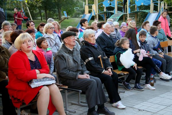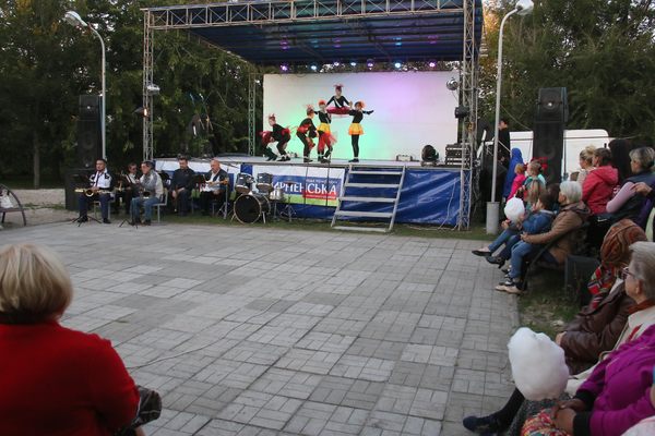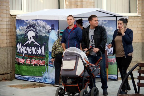Празднества проходили в сквере перед поссоветом. В этом году обошлись без торжественных речей. Со сцены жителей Мирного поздравляли только художественные коллективы и специальные гости - мелитопольский духовой муниципальный оркестр.