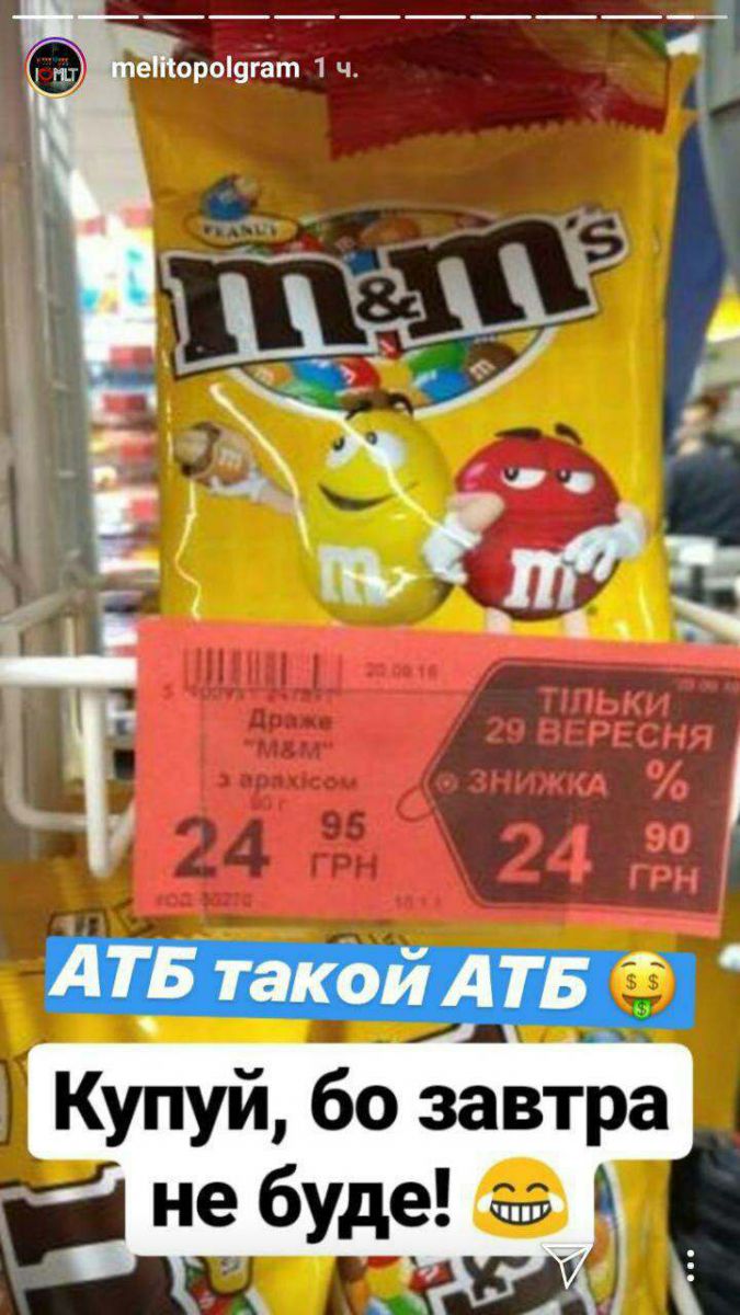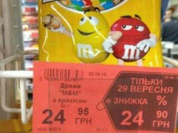 Скидки, действительно, поражали воображение, причем, на некоторые позиции отнюдь не своей щедростью. Например, на пакетик конфет M&M’s магазин предоставил скидку... 0,2%.