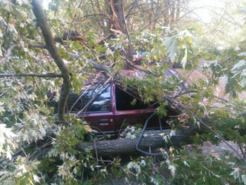 Инцидент возле дома № 8 в переулке Яворном. Большое дерево рухнуло на машину и придавило ее, нанеся серьезные повреждения.