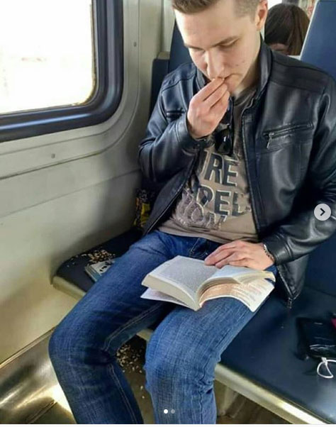 В соцсети обсуждают молодого человека, который читает бумажную книгу и бросает шелуху от семечек прямо на пол электрички.