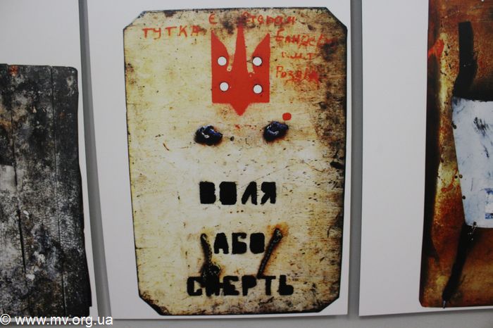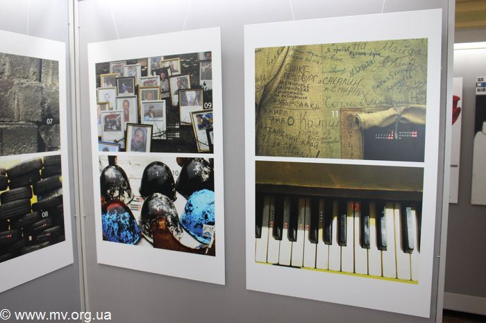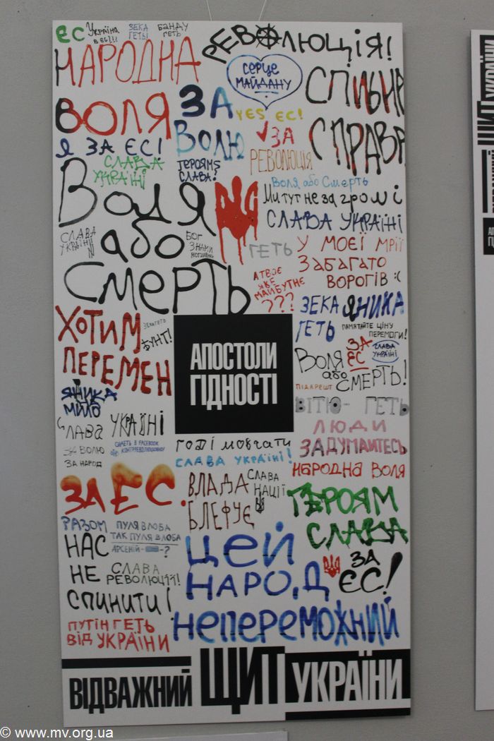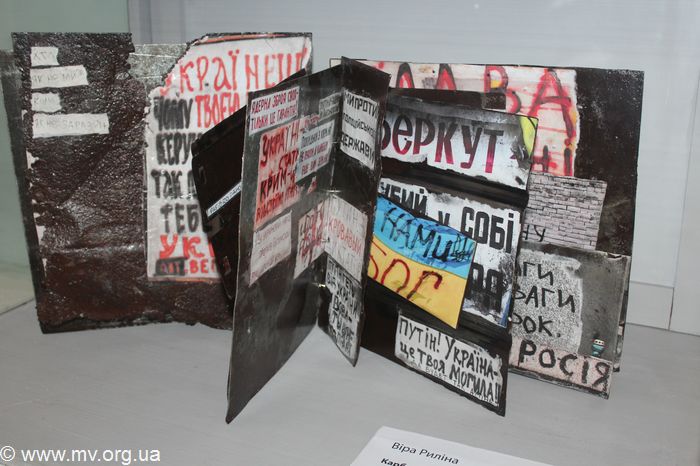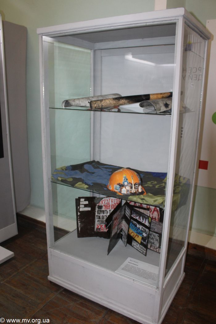 Уникальная выставка дополнена оригинальными экспонатами из фонда Национального музея Революции Достоинства: бейсбольная бита, каска с изображением монумента Независимости, защитные наколенники, которые служили защитой во время противостояний. Аппликация «Казак-всадник» из нашивок на ткани красноречиво выражает отношение людей к происходящим событиям. Невозможно равнодушно пройти мимо таких эмоций, выраженных с помощью искусства.