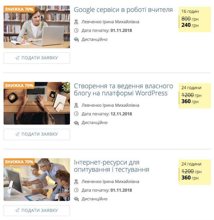 Відповідно до вимог, які реформа висуває до вчителя, він має володіти навичками комп’ютерної грамоти. З цією метою у розділі порталу «Курси» було створено нові дистанційні курси «Створення та ведення власного блогу на платформі Blogger» та «Google сервіси в роботі вчителя», а також «Інтернет-ресурси для опитування і тестування». Вони допоможуть вчителю підвищувати ефективність навчання та забезпечать професійний ріст педагога. Методичні матеріали зібрано у розділі «Бібліотека», а розділ «Олімпіади» запрошує учнів 1-11 класів до участі у дистанційних предметних олімпіадах.