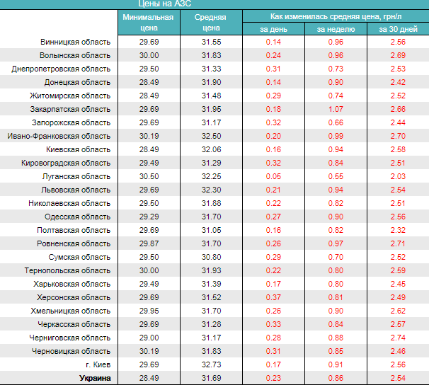 Данная цена является максимальной для этого вида топлива за последние 30 дней и на 2,41 грн больше минимального значения, которое было зафиксировано 11 сентября и составляло 28,73 грн/л.