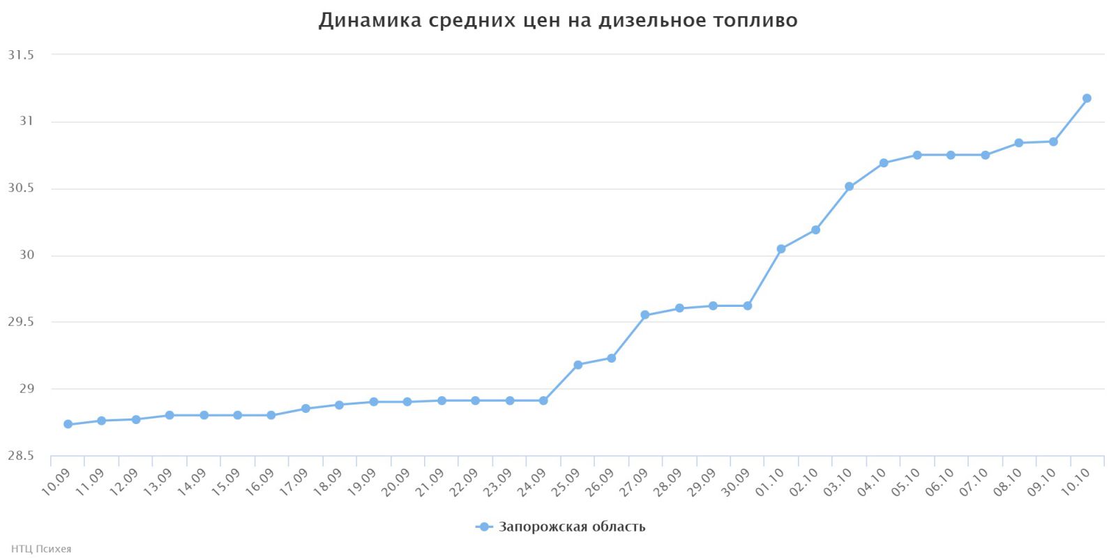 Повышение средней розничной цены на ДТ Евро в Запорожской области за день составило 0,32 грн/л, что является самым большим подорожанием по Украине. Средняя розничная цена этого вида топлива в области составляет 31,17 грн/л.