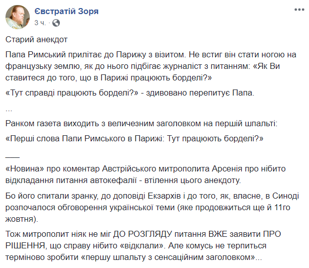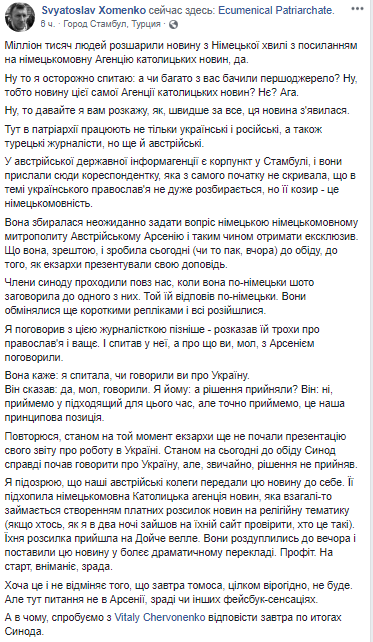 Повторюсь, по состоянию на тот момент экзархи еще не начали презентацию своего отчета о работе в Украине", - говорится в сообщении.