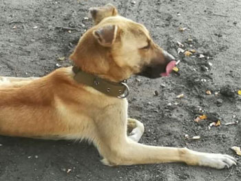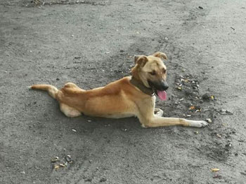Не смотря на всю его не легкую жизнь он не озлобился на нас, людей. Виляет хвостиком и немного улыбается.