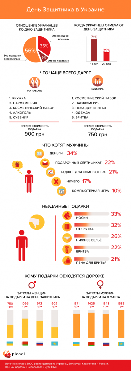 Если же сравнить затраты на подарки на 14 октября и на 8 марта, стоимость подарков женщинам почти в 2 раза выше, чем мужчинам (1371 грн против 750 грн).