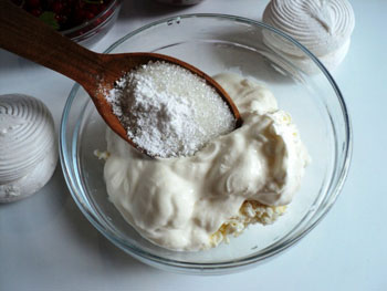 1. Взбейте творог со сметаной и сахаром до однородности. Желатин разведите, как указано на упаковке.