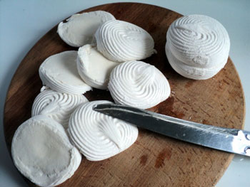 3. Разделите зефир на половинки и выложите плотно друг к другу в разъемную форму для выпечки.