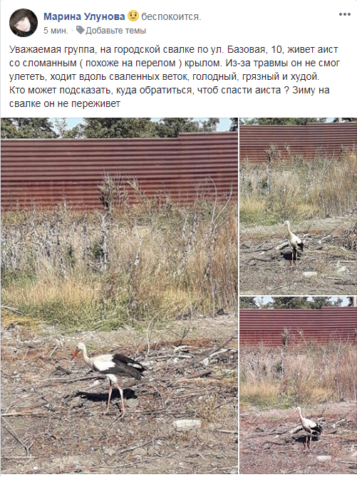 Скорее всего, у нее сломано крыло. Сейчас аист в плачевном состоянии — птица грязная и истощённая.