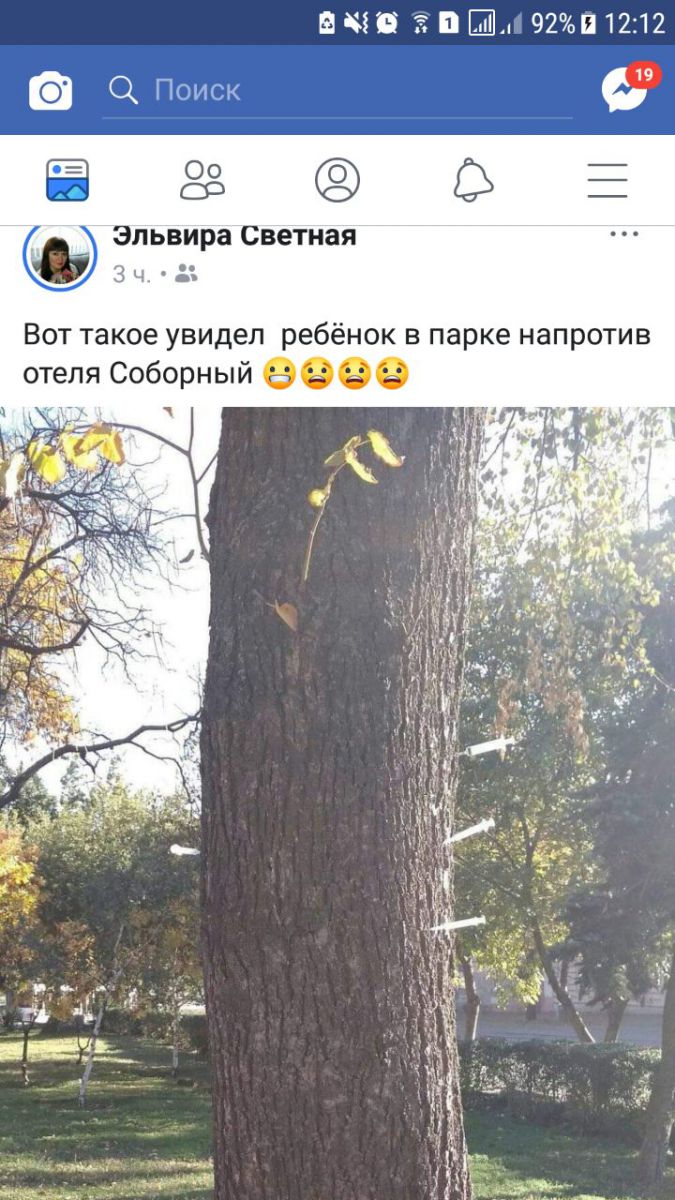 Запорожанка опубликовала на своей странице в соцсети Facebook фото, которое сделал в парке её ребёнок. На фото изображена жуткая инсталляция из шприцов воткнутых в дерево.