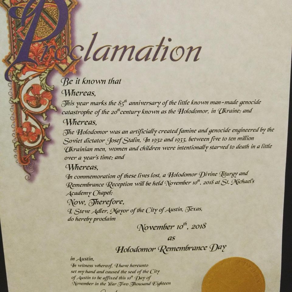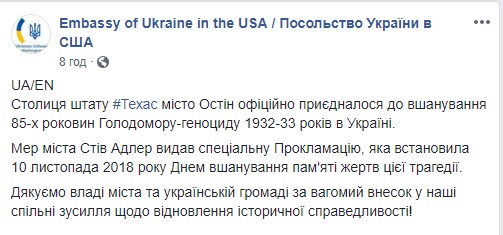 "Столица штата Техас, город Остин, официально присоединилась к почтению 85-й годовщины Голодомора-геноцида 1932-33 годов в Украине", - говорится в сообщении.