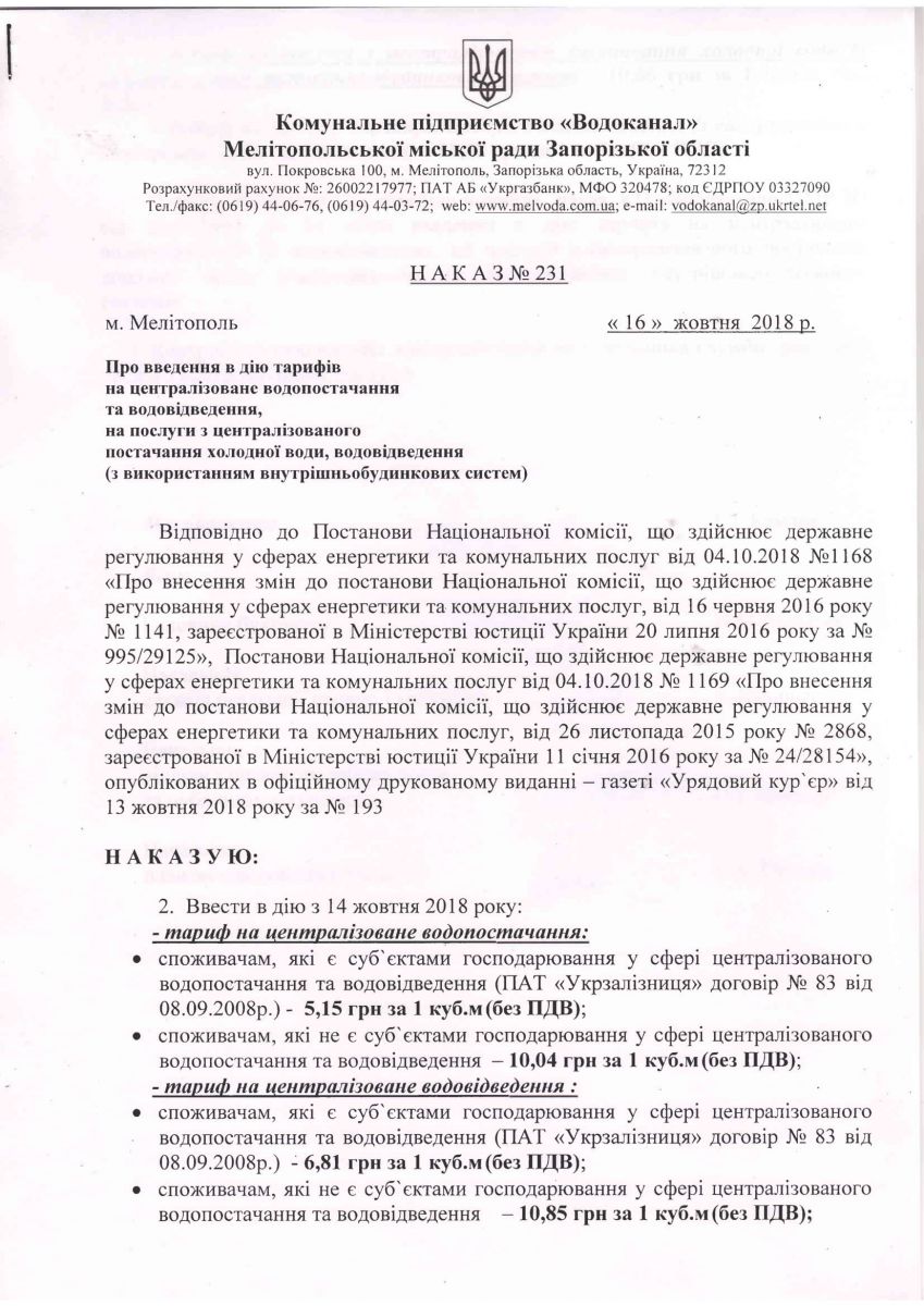 Вчера в КП «Водоканал» был подписан приказ о введении новых тарифов на услуги централизованного водоснабжения и водоотведения. Согласно документу, новые тарифы уже вступили в силу 14 октября.