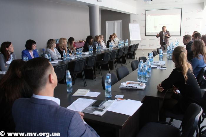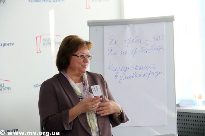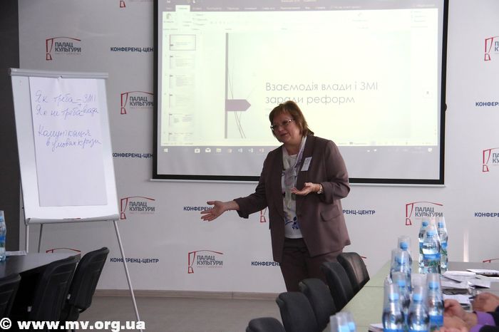 Ведет мероприятие тренер из Киева Мария Лашкина - кандидат наук в области государственного управления, доцент кафедры журналистики, рекламы и связей с общественностью Института международных отношений НАУ, помощник-консультант народного депутата Украины по вопросам коммуникации и взаимодействию со СМИ.