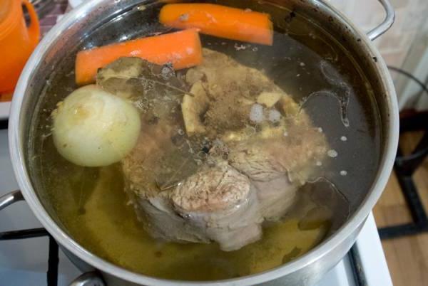 4. Мясо и грудинку выложите отдельно и дайте остыть. Остальные ингредиенты больше не понадобятся, их можно вынуть, а сам бульон процедите.
