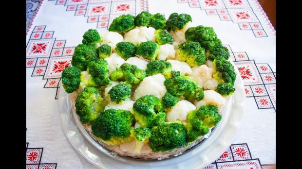 10. Приступайте ко второму слою. Выложите соцветия капусты, чередуя их с брокколи. Поставьте все в холодильник на 20-30 минут. Это нужно, чтобы застыл первый слой торта.