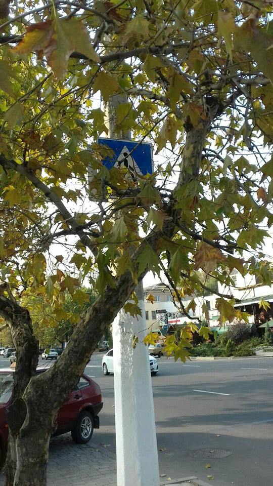 Не все мелитопольцы остались довольны переносом перехода. В частности, в социальной сети выложили фото знака, установленного на новом месте, который совсем не видно за деревом.