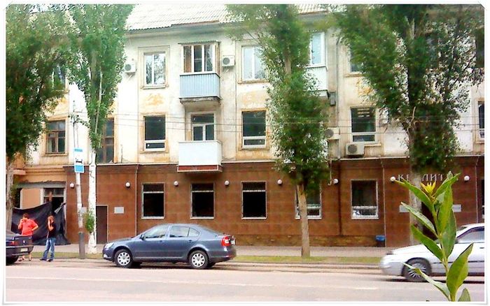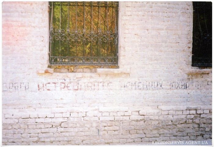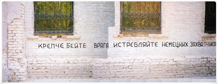 Мелитополец Игорь Бовкун прислал в редакцию фотографии Виктора Исакова. На них – здание, где сейчас располагается клиника, отснятое в 2004 г., до ремонта. Проглядывается забеленная, но все же видная, надпись: «Крепче бейте врага. Истребляйте немецких захватчиков».