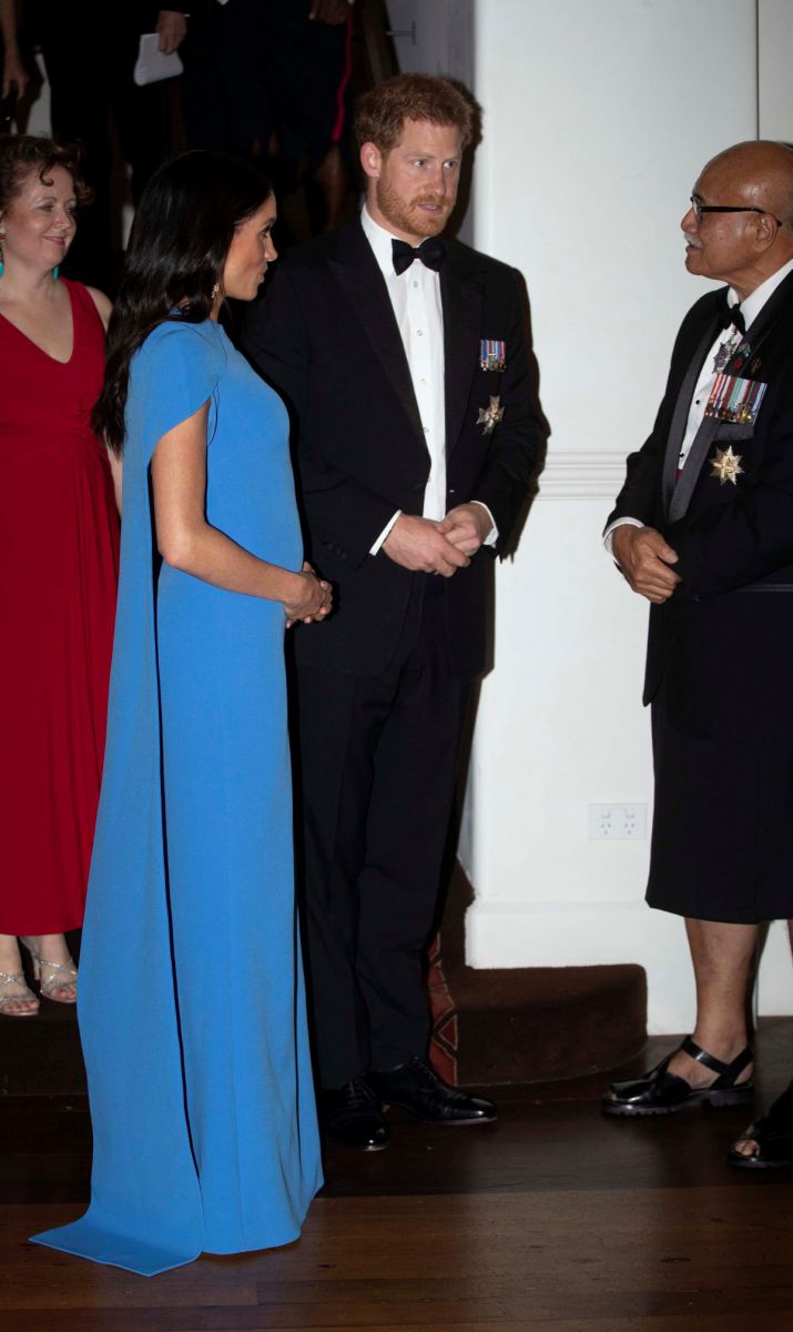 В настоящее время Маркл находится на четвертом месяце беременности. Супруга принца Гарри подчеркнула явно округлившийся живот необычным платьем на приеме в Фиджи. Герцогиня надела ярко-лазурное платье.