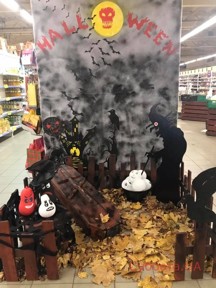 Так, гостей в магазине теперь встречает гроб, огражденный забором, который стоит на осенних желтых листьях. Таким образом магазин готовится к Хеллоуину.